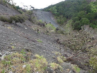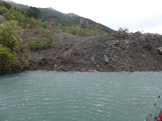 This photo shows the size of the landslide. A large section of forest has slid down with it with many trees still standing. The debris has again blocked the valley to form a lake.